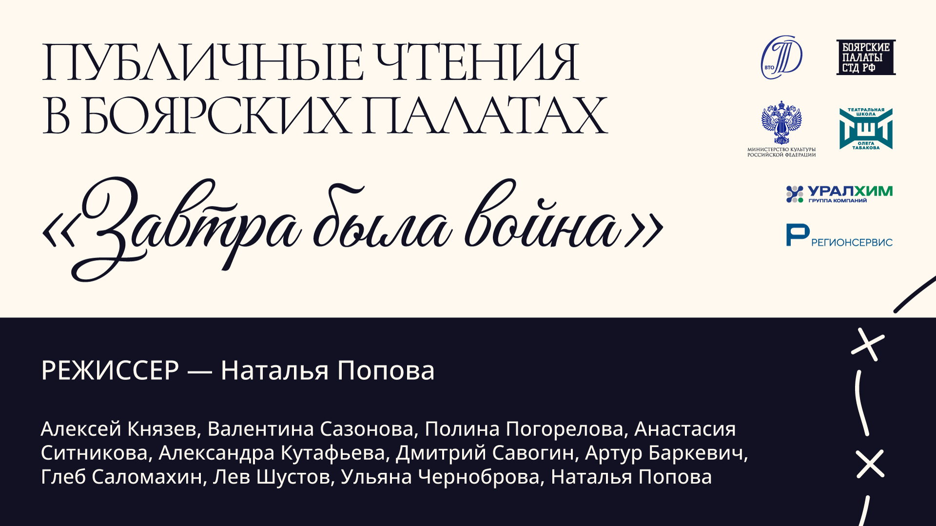 11 декабря в 19:00 в исторических Боярских палатах состоится публичная читка инсценировки по повести Бориса Васильева «Завтра была война». Постановочная работа ведётся под руководством режиссёра Натальи Поповой — преподавателя Театральной школы Олега Табакова и актрисы Театра Олега Табакова. В читке примут участие студенты 3 курса Московской театральной школы Олега Табакова.
